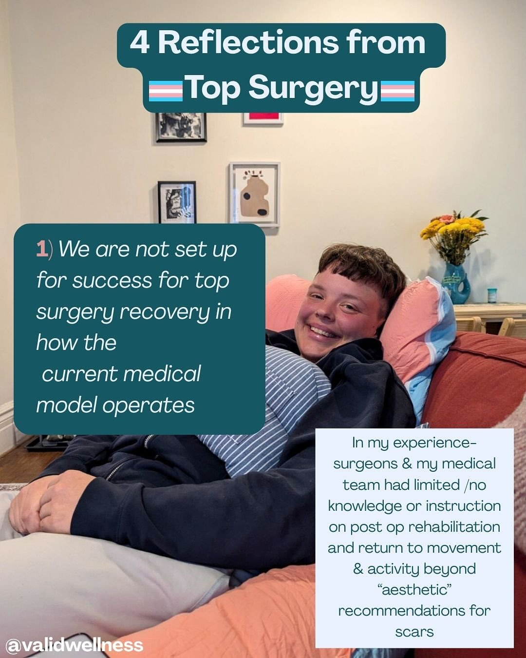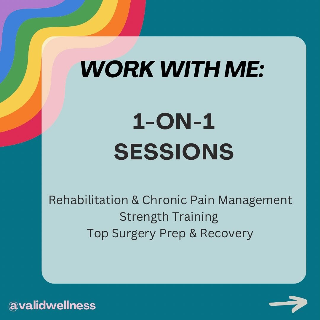 I specialize in chronic pain management, gender affirming approaches to movement (including top surgery prep/recovery) and size-inclusive, embodied strength training and weight lifting for anyone, from experienced lifters to folks who have never stepped foot in a gym before (spoiler alert-we also don’t ever need to step foot in a gym to work together).
